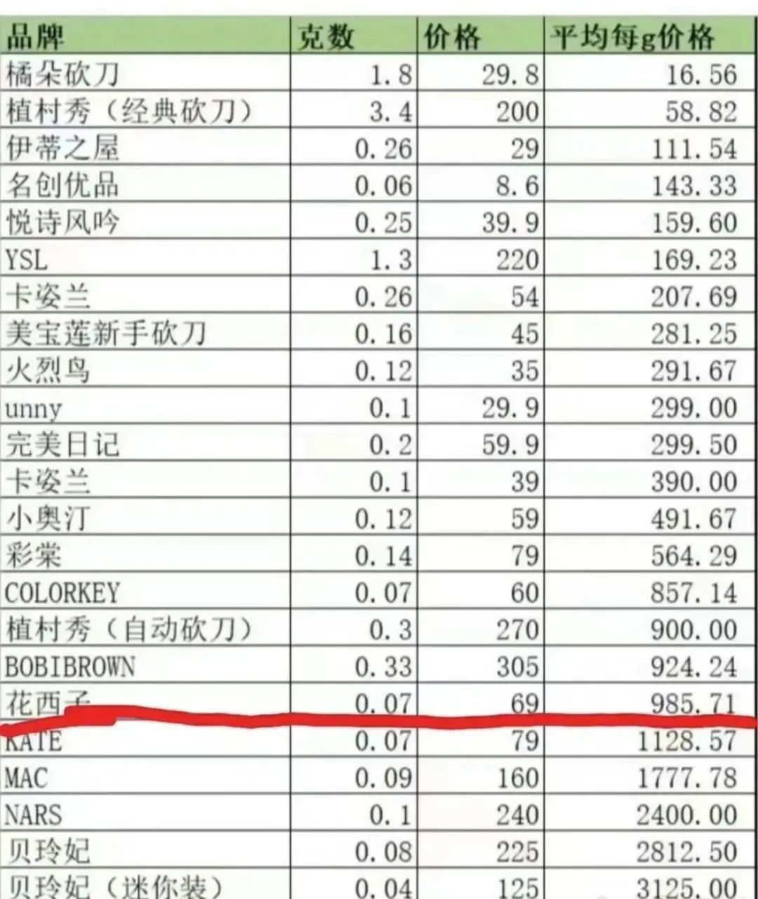 网友进一步计算了花西子的眉笔,售价超过黄金,单克花西子眉笔的价格达到985.71元。有网友甚至还将各美妆品牌眉笔每克的价格做了一个整合对比,调侃花西子价格,因其单克价格确实堪与国际大牌比肩。