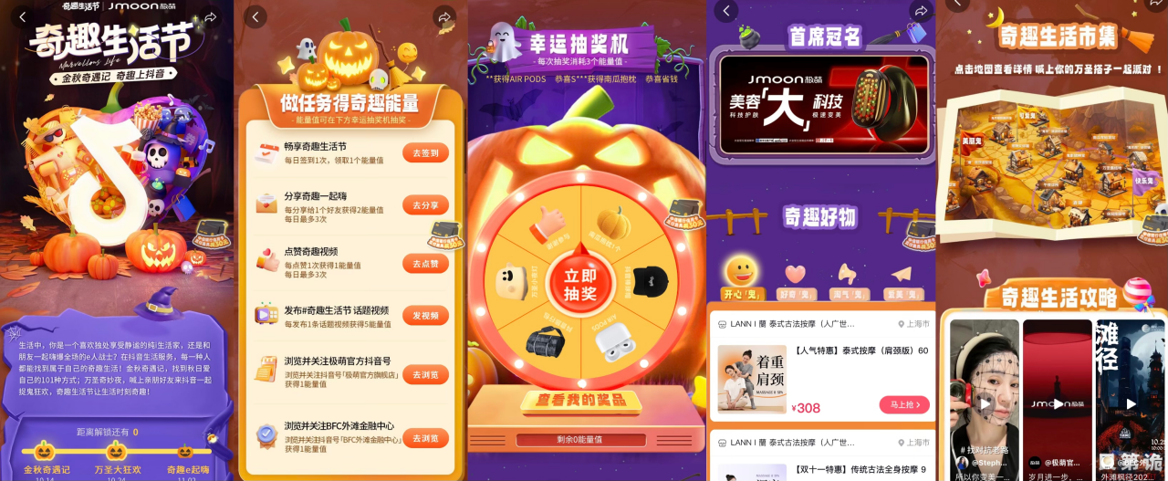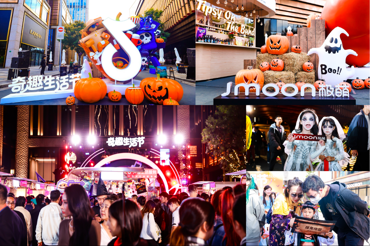 「奇趣生活节」线上有惊喜,线下也有奇遇。抖音生活服务综合行业联动数十个商家,在时尚潮人聚集地上海“BFC外滩枫径”打造「奇趣生活市集」,把节日氛围推向高潮。vivi王婉霏空降现场,与大家一起嗨玩。万圣主题秀、路边音乐会、cos变装挑战、新鲜剧本杀等花式玩法轮番上演,让I人E人们一次玩儿到尽兴。