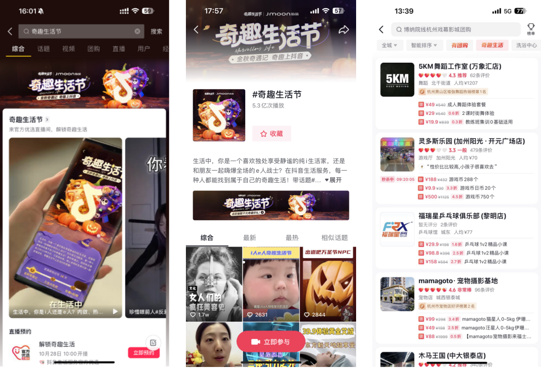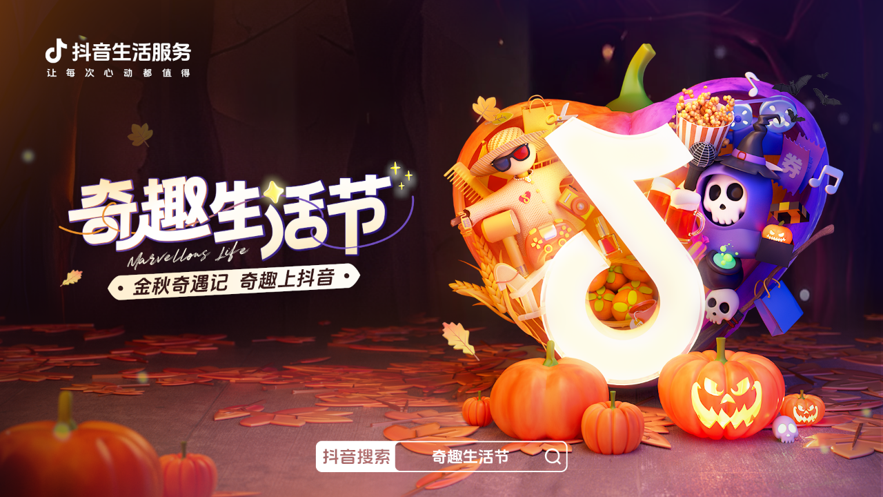 近日,M360关注到,抖音生活服务综合行业推出的「奇趣生活节」,这个横跨金秋和万圣的节点活动,吸引了I人E人们的广泛参与,线上线下一站式过节。超过6万的生活服务商家,与年轻人们玩在一起。