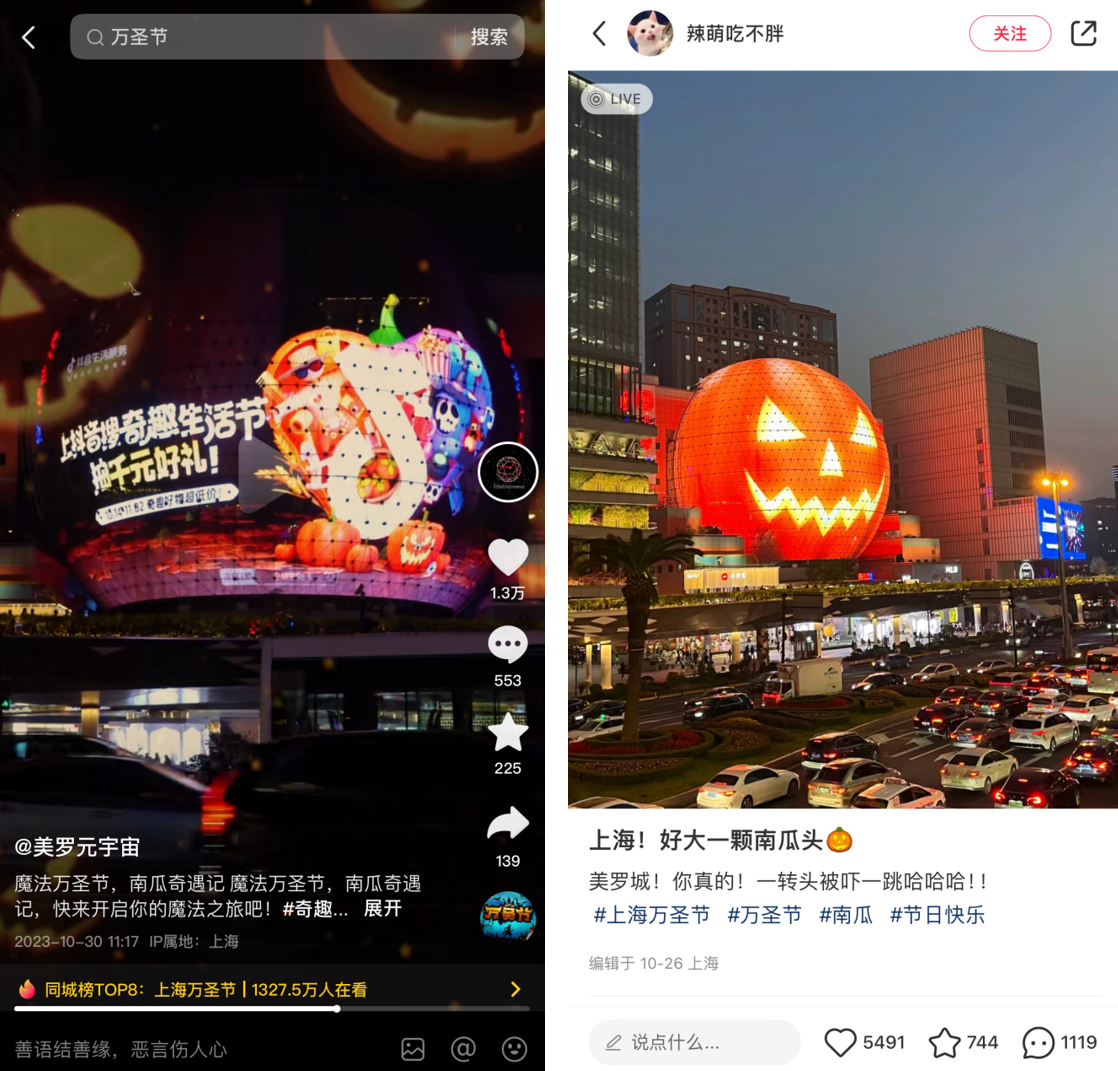 「奇趣生活节」线下奇遇“不设限”。抖音生活服务还联动了户内外大屏,把奇趣生活氛围“染遍全城”。当上海地标徐汇美罗城球幕,被超大南瓜点亮时,更是在社交媒体引发了广泛热议。用户与这些线下大屏“奇遇”后,打开抖音搜索关键词“奇趣生活节”,即有机会获取商家送出的惊喜福利。