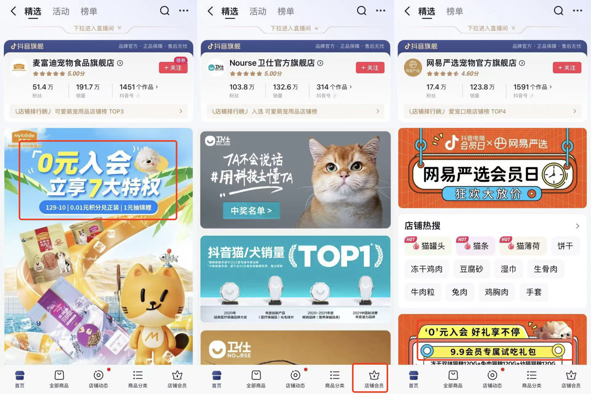 留存的目标是提高用户的活跃度和使用频率,增加用户的粘性和满意度。本季宠物类品牌尝试提供符合用户需求和喜好的内容、服务、功能等。例如,抖音官方账号首页有会员入口,可以让用户通过购买品牌产品成为品牌会员,后续享受更多的会员权益、品牌信息及时推送、专属客服等特权,满足用户的多样化需求,增强用户对品牌的依赖和信任。