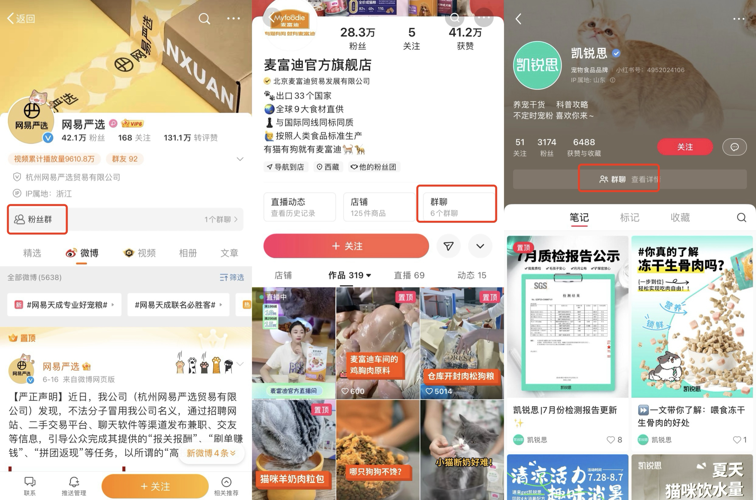 将已经活跃和使用平台或产品的会员促活,也是衡量宠粉能力的重要指标之一。宠粉能力较好的品牌,如网易严选、麦富迪、凯锐思等,都有相关私域运营。在账号首页展示醒目的群入口,设置低门槛,让用户通过点击即可加入粉丝群,与其他粉丝交流分享心得、推荐产品、参与活动等,形成社群效应,刺激用户的购买欲望和行为。