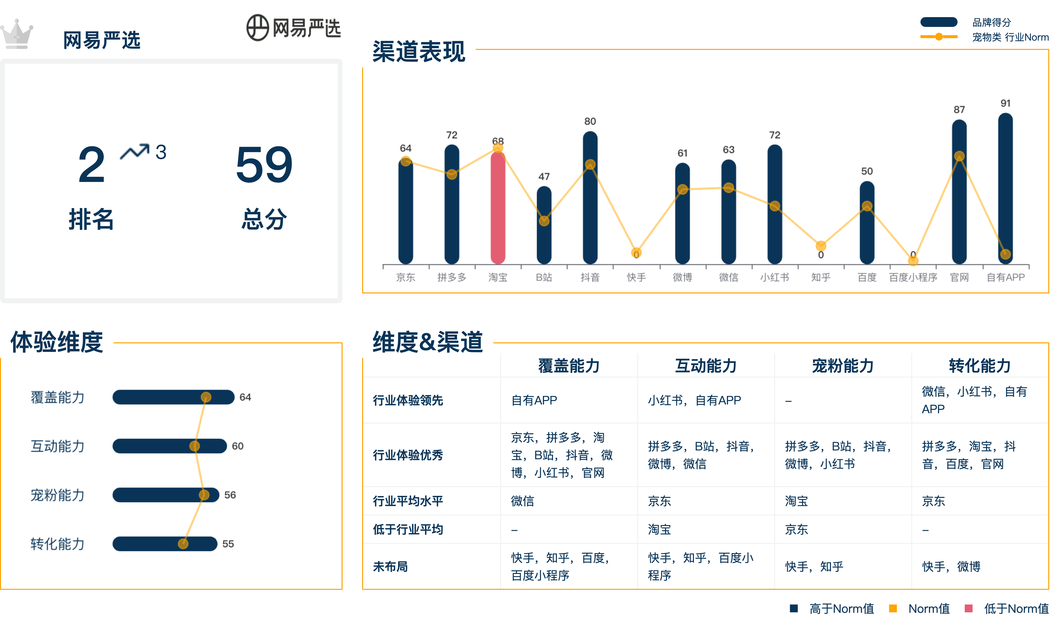 宠物类行业排名第2是『网易严选』,品牌排名相对上一期上升3名,品牌体验得分为59分。