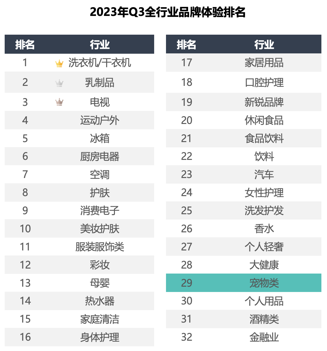 新锶体验最新发布的2023年Q3品牌体验榜单中,宠物类行业品牌体验指数为44,在全行业中的品牌体验排名为第29位。相较于上一季,行业数字化体验得分减少1分,增长不敌其他行业,在全行业的排名下降3名。