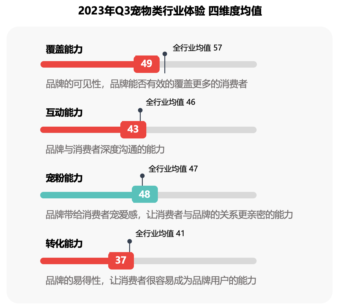 2023年Q3品牌体验数据显示,宠物类行业除宠粉能力表现高于全行业平均,其余均低于全行业均值。相较于上一期,宠物类行业互动能力、宠粉能力得分有所增长,分别增长2分、5分。覆盖能力表现不尽如人意,得分下降3分。