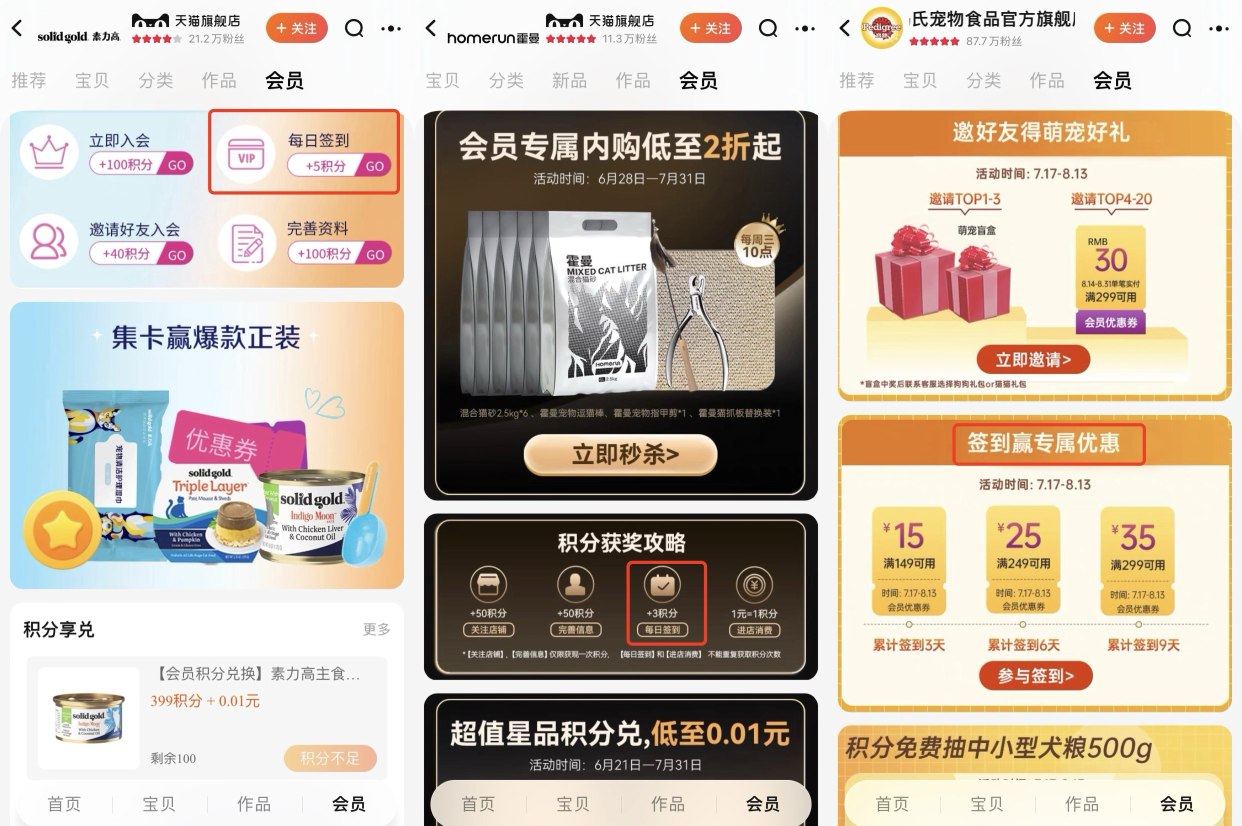 宠粉能力的提升有效促进用户转化,增加用户的基数和收入。本季54%的宠物品牌在官方店铺首页设置会员签到,让用户通过每日签到获得积分、优惠券等奖励,激发用户的兴趣和参与感,促进用户注册成为会员。