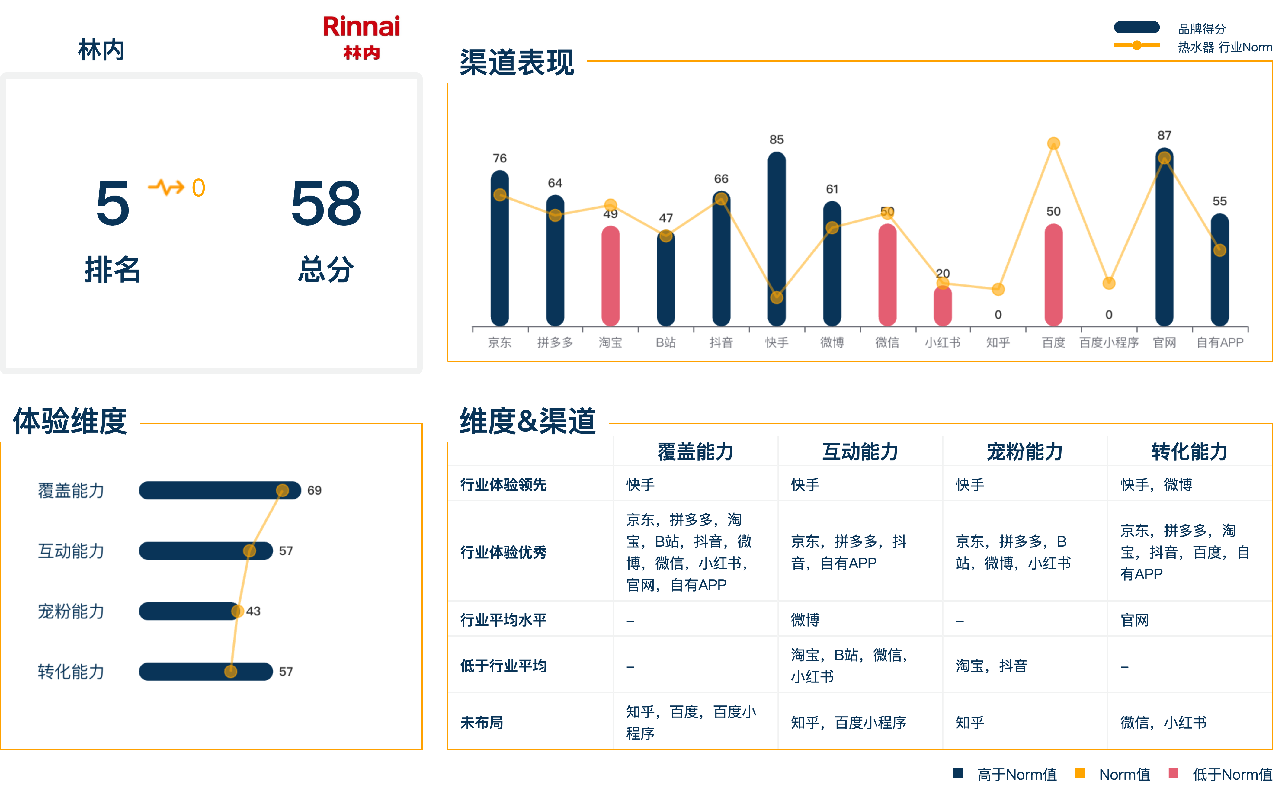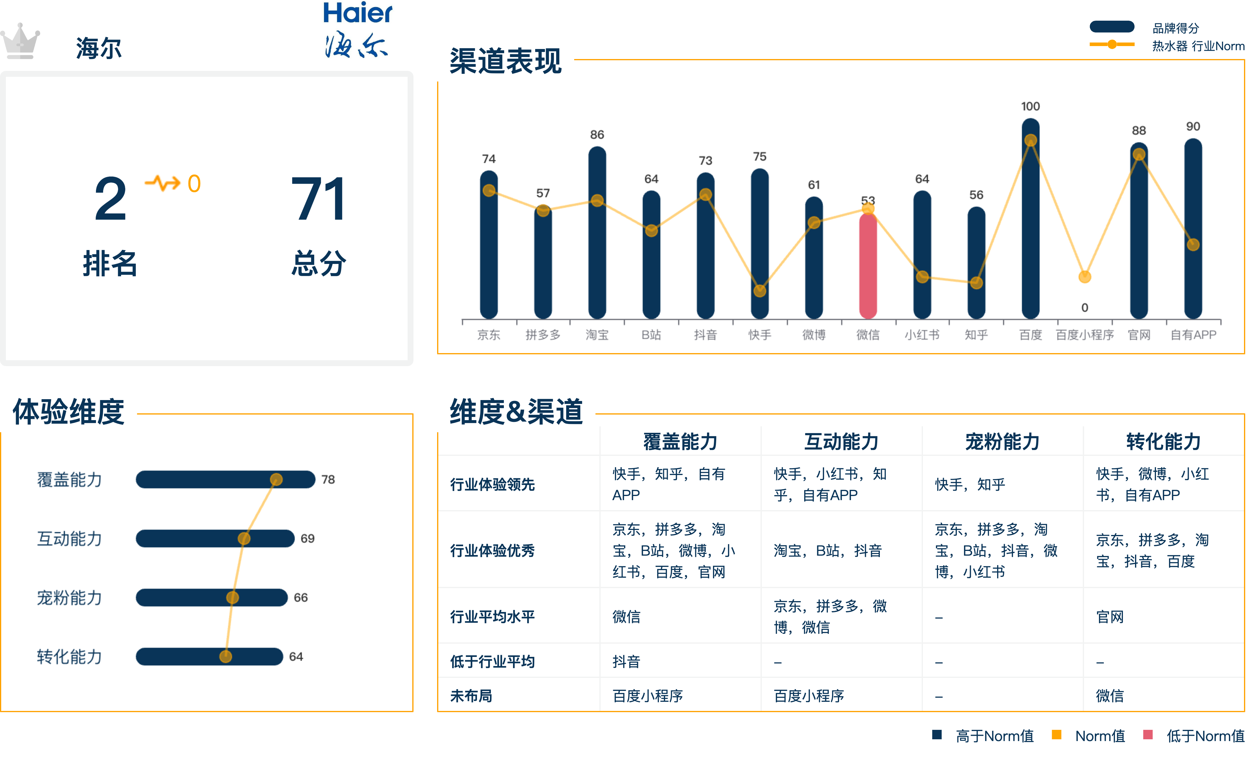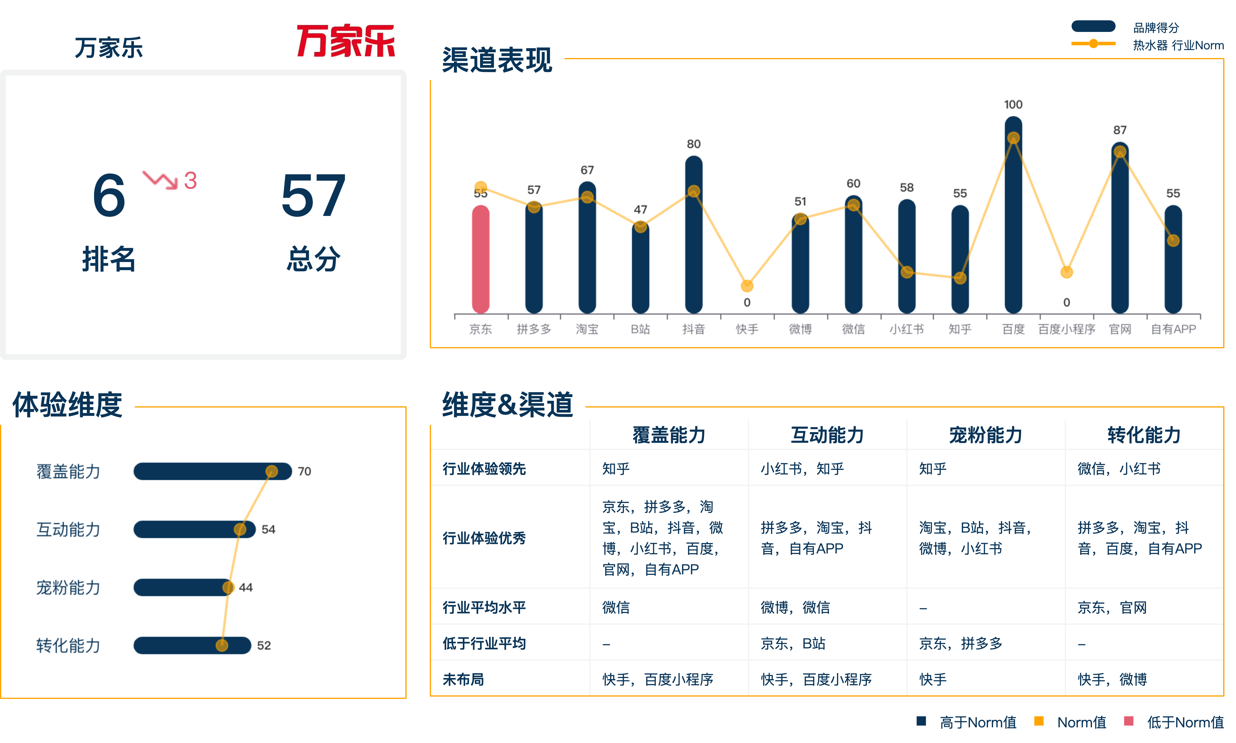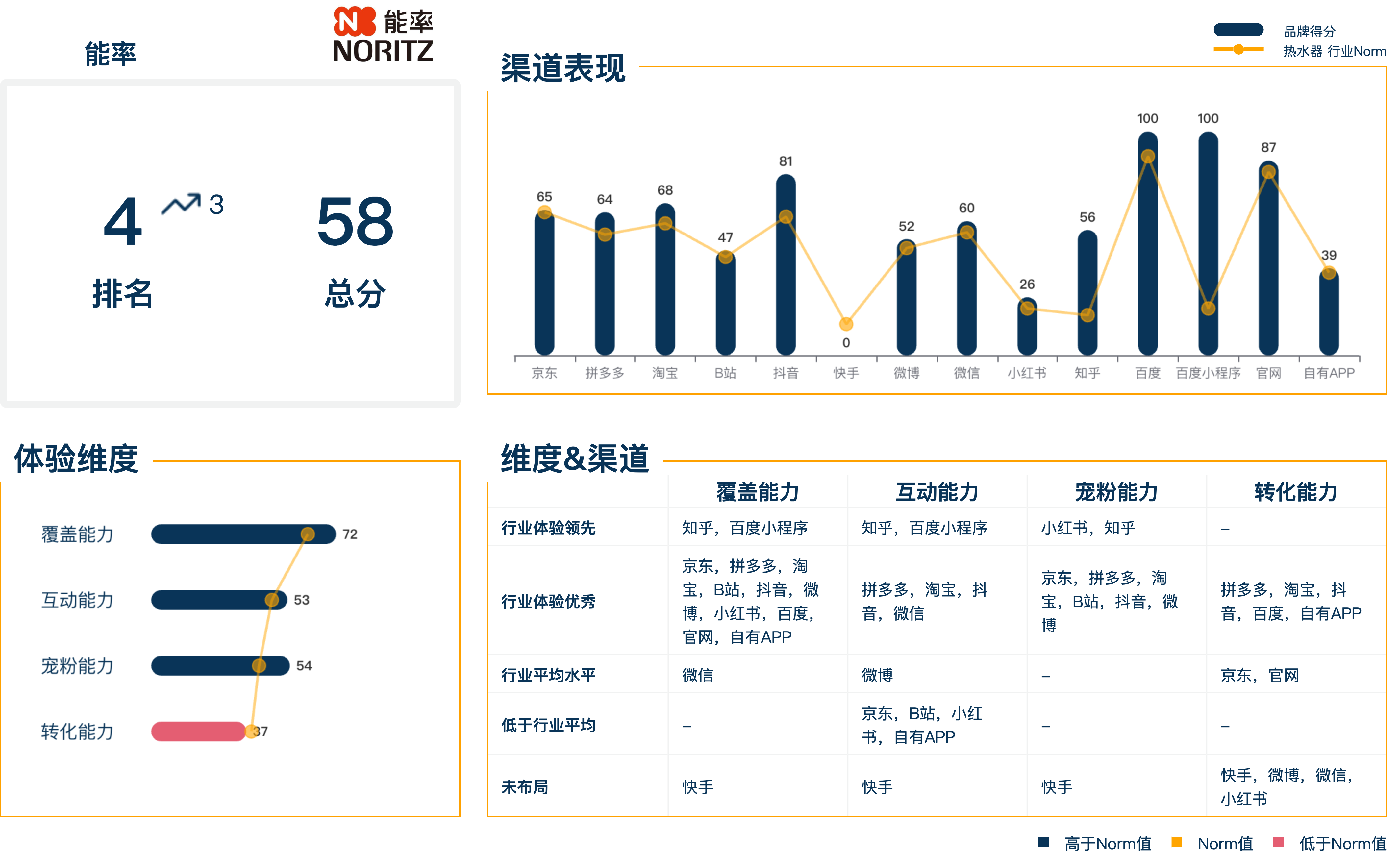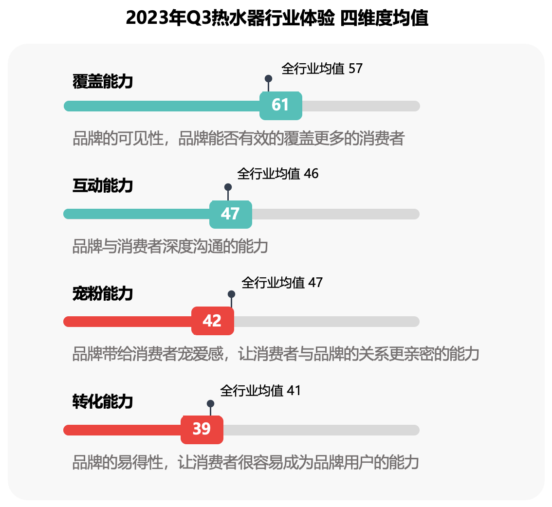 品牌的四项能力联动,为在前端带给消费者更好的体验。但与上一季相比,本季热水器行业四项维度得分均有不同程度的下滑。