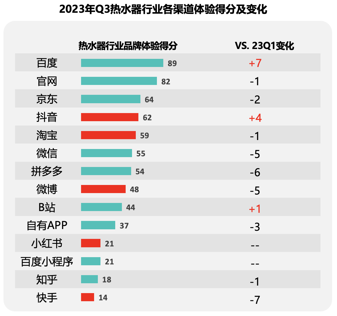 相比2023Q1,本季度热水器行业在21%的渠道上实现了增长,得分增长最多的渠道是百度,相较上一季得分增加7分。64%的渠道体验表现与上一季相比有所下滑,下滑最多的是快手渠道,得分减少7分,目前渠道体验得分为14分,低于全行业均值。