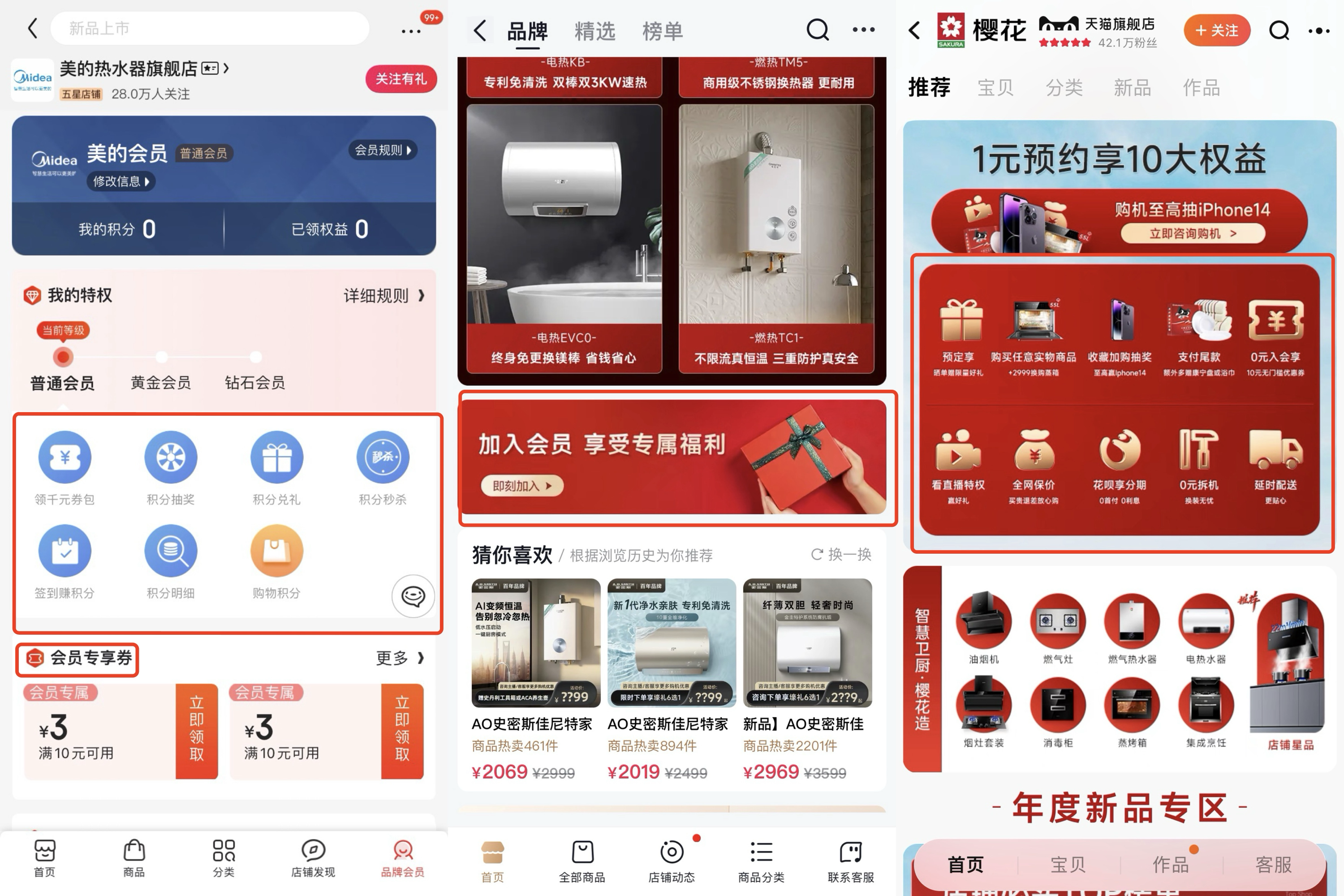 比如,美的在京东官方店铺中设置会员专享礼券、抽奖、积分秒杀等活动;史密斯在抖音等社媒渠道设置入会专享福利;樱花对于会员设置诸多丰富的福利与活动,如预定礼、抽奖、保价等权益。