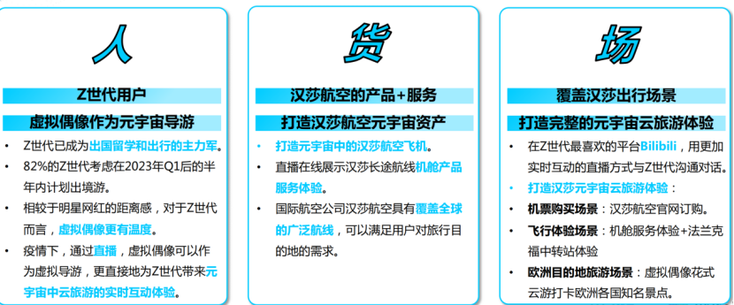 Z世代的人货场:人——Z世代用户,虚拟偶像作为元宇宙导游;货——汉莎航空的产品+服务,打造汉莎航空元宇宙资产;场——覆盖汉莎出行场景,打造完整的元宇宙云旅游体。