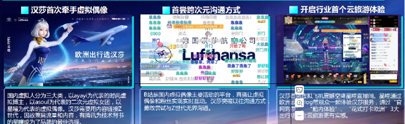 2.汉莎航空需要用最头部的虚拟偶像, 在Z世代最喜欢的平台Bilibili用更加实时互动的沟通方式与Z世代对话;通过顶尖的元宇宙虚拟技术,把汉莎的产品、服务以及旅行目的地