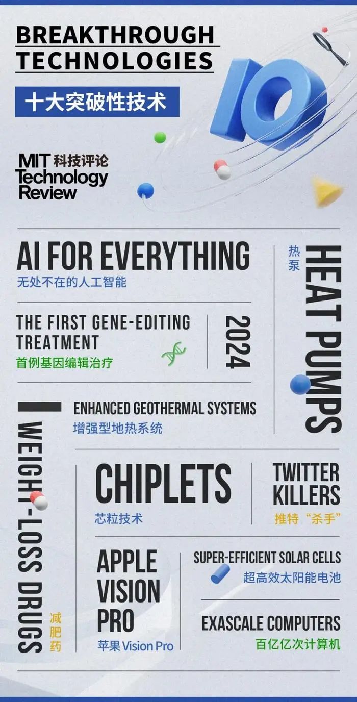 在最新的 2024 年“十大突破性技术”榜单中,我们依旧重点关注那些有望对世界产生真正影响的、有前途的技术。这些技术展示出的无限的可能性,为我们描绘出了一个更加绿色、健康、智能的未来。