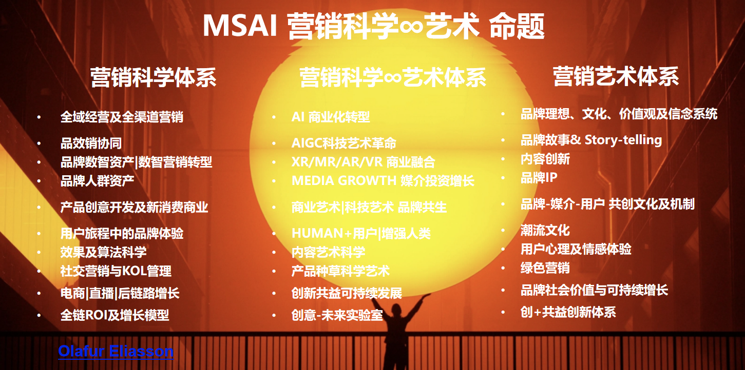 MSAI(Marketing Science ∞ Arts Innovation)营销科学∞艺术创新平台,自2022推出以来,与M360 及INNOVATION+ 创+创新平台三轮驱动,推进企业营销科学∞艺术战略体系化建设,从中国到全球,助力企业增强营销科学体系,夯实营销艺术体系,创建营销科学∞艺术融合创新开放平台,推动营销创新、品牌焕新及多元可持续商业增长。MSAI将推进营销科学∞艺术创新战略体系建设,聚焦AI商业战略升级、全链数智化转型、品牌数智资产BRANDTECH、XR/VR/AR/MR 混合沉浸体验、品牌焕新、社会化品牌、内容创意与共创、MEDIAGROWTH、HUMAN+用户为中心的创意设计等议题,为品牌可持续生意增长注入新动能。