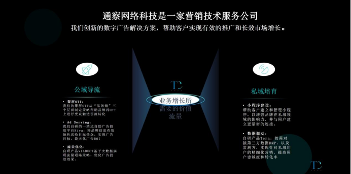 但我们这个模型不是那一类,它是一个多年前跟随4P理论一起提出的比较经典的计量经济学的模型。在AI时代,为什么我们还要去讨论这个经典模型呢?大家可能不太熟悉通察科技,我们主要是给4A和广告组在后端做OEM和white label产品,我们其实就做两个事情,一个就是关于导流,一个就是私域培育。