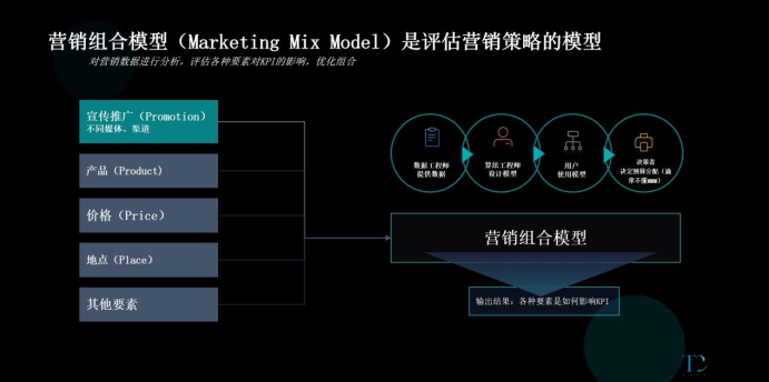 接下来简单介绍一下营销组合模型。前面华为云分享了一个自己的天气APP功能,如果做比喻的话,营销组合模型很像一个云图,你可以看到什么因素会影响今天天气,比如说今天广州很冷,上海也很冷,那是什么影响了天气?未来天气的变化如何?营销组合模型也是一样的,它是通过对4P的分析来了解哪些因素影响你的KPI,哪些可以优化。它还会带一个预测模型,如果你调整某一个因素,比如说产品变化,价格变化,或者分销渠道变化,这些会如何影响KPI?