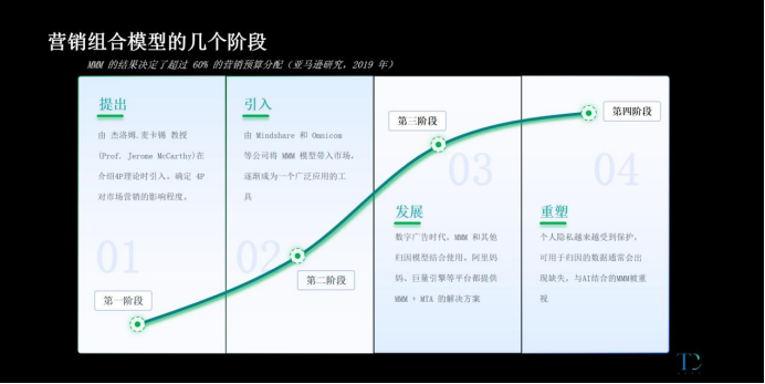 由于时间关系,我们只介绍发展和重塑这两个阶段,MMM模型的应用非常广泛,2019年差不多有60%的营销预算分配其实是受到MMM模型结果影响的。我们可以算一下,比如说美国2023年差不多是4000亿,那60%也就是2000多亿。这个预算分配其实是通过MMM进行的。