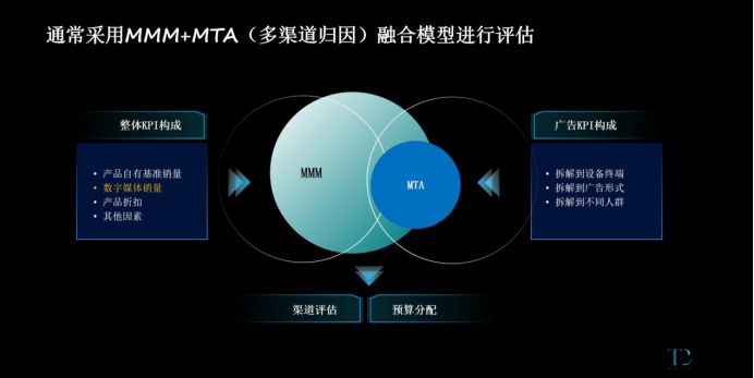 第二步是实践层面,目前常用的做法就是通过MMM模型和MTA模型做一个综合评估,如果大家用巨量或者是阿里的一些产品,其实都可以提供这个打包功能。最后我们可以通过MMM实现对渠道的评估和优化预算分配。
