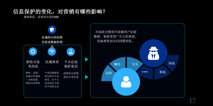 而且现在MTA也很好用,那为什么现在我们还要重新去把MMM模型捡起来呢? 这是因为信息保护的变化。我们知道现在因为信息保护变化以后,一部分用户级别数据其实越来越难获取到了,这是第一个现实。比如说MTA的模型在访问、曝光和交互以后到转化,其实很多时候我们check不到了。另外就是可能跨域和跨生态的一些存在,比如说用户在头条广告和在淘宝的购买,虽然之前有click ID或其他方式,但确实越来越难抓取到了。