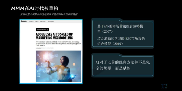 另外就是大家一直在讲迭代品牌焕新,其实对于技术来说,它也是一个需要不断焕新的过程。虽然说通察这个产品我们在2013年就上线了,但是十年的过程中,我们也对于这个模块进行了很多的迭代,前面我们讲的MMM模型其实就在我们产品其中一个模块。可能很多年之前,我们用的是07年基于ANN模型的一个简单预测,但在19年,我们又结合现在实际的一些AI上的东西来进行运用。所以对于我们来说,这些模型变化当然很快了。