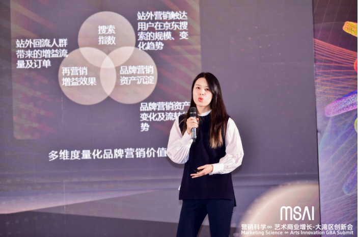 在MSAI营销科学∞艺术商业增长-大湾区创新会上,京东零售广告销售与运营部广告效能提升部负责人翟婷婷,从人、货、场三大维度,分享了京东助力品牌长效经营的秘籍。