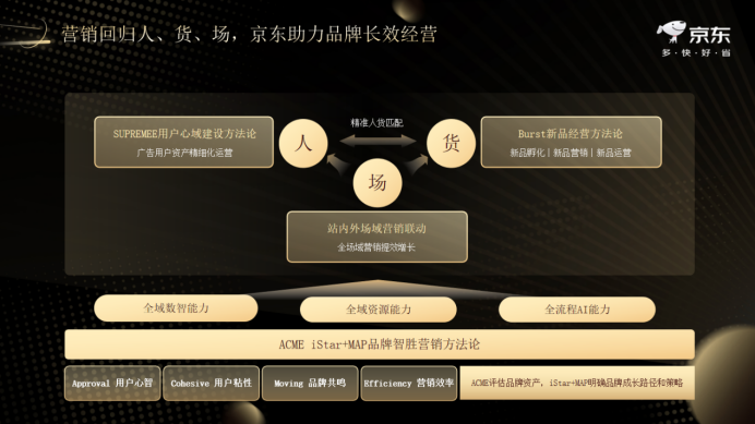整个人货场策略的实现,是基于京东过去在非常长的一个周期内,对数据分析能力的不断钻研和下探、全资源整合能力的提升、以及借助AI能力实现智能投放与智能驾驶。