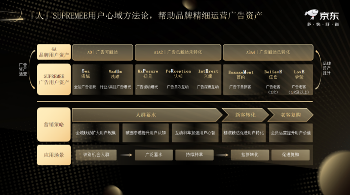 在人的方面,京东推出了4A营销方法论。品牌在应用环节中,也提出了更多的广告、用户资产精细化运营的需求,所以京东在过去一年多的时间里,升级了搜费与用户心域方法论。
