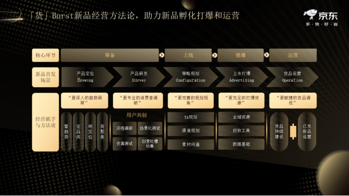 在Burst新品经营模型上,京东在新品营销、新品运营上,通过数据能力的应用以及数据技术的下探能力,帮助品牌去拓展新品数据营销,在新品孵化环节给予更多的支持。