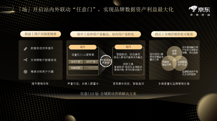 在全域投放层面,品牌一直以来就有站外投放蓄水、站内收割的一套营销方法。过去,更多的是品牌直接通过人力或者经验去做前后链路投放。现在,我们把更多的技术、算法模型放到蓄水与回流的过程中,希望通过一键智能,使整个站内外投放提效。当品牌在站外投放之后,京东会形成用户人群包,并利用算法进行动态调优、自动扩量。当品牌再去投站内触点渠道时,通过自动化和序列化的投放能力,就可以更高效地联动追逐目标客户,实现站内站外1+1大于2的效果。