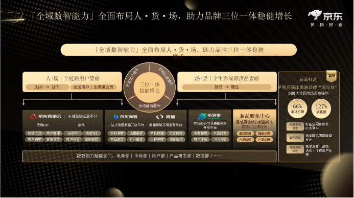 京东提供全域数智能力,帮助品牌布局人货场。在实践人货场策略时,京东也会为品牌提供很多基于数据的工具。以伊利高端冰淇淋品牌“须尽欢”为例,通过京东数据中心和调研发现,国风团扇这样的造型设计包装,更能够打动消费者,快速获得市场份额和销售额的提升。