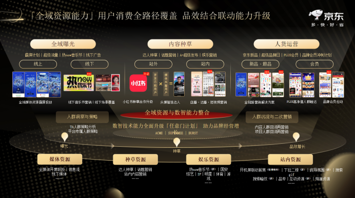 全域资源能力上,京东虽然是一个电商平台,其实我们一直在不断去整合各种资源,提供品牌沟通的新机会。除了线上、线下的曝光,京东也有各类营销IP,在内容种草领域与小红书、抖音等深度合作。通过这种联动,帮助品牌捕捉更广泛的媒体兴趣用户,同时在站内内容场景中做营销承接。京东有全域资源的解决方案,不断去加深人群洞察与策略,尤其是人群的二次营销能力,真正实现人货场的匹配。