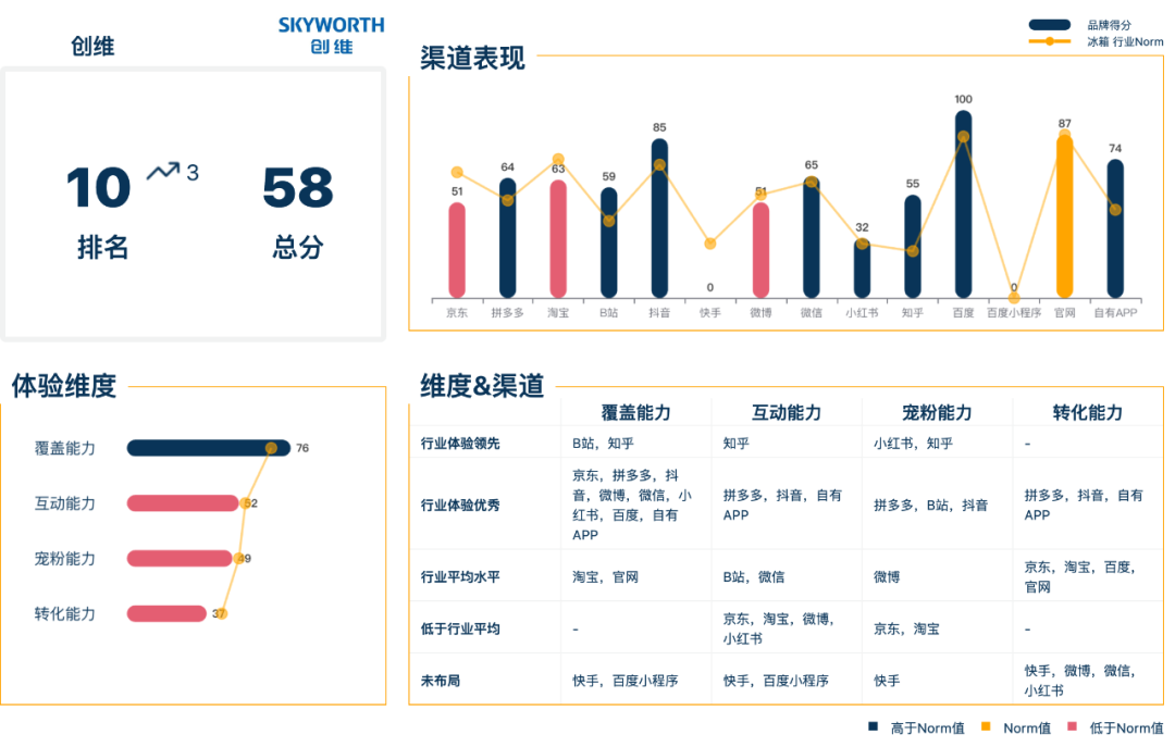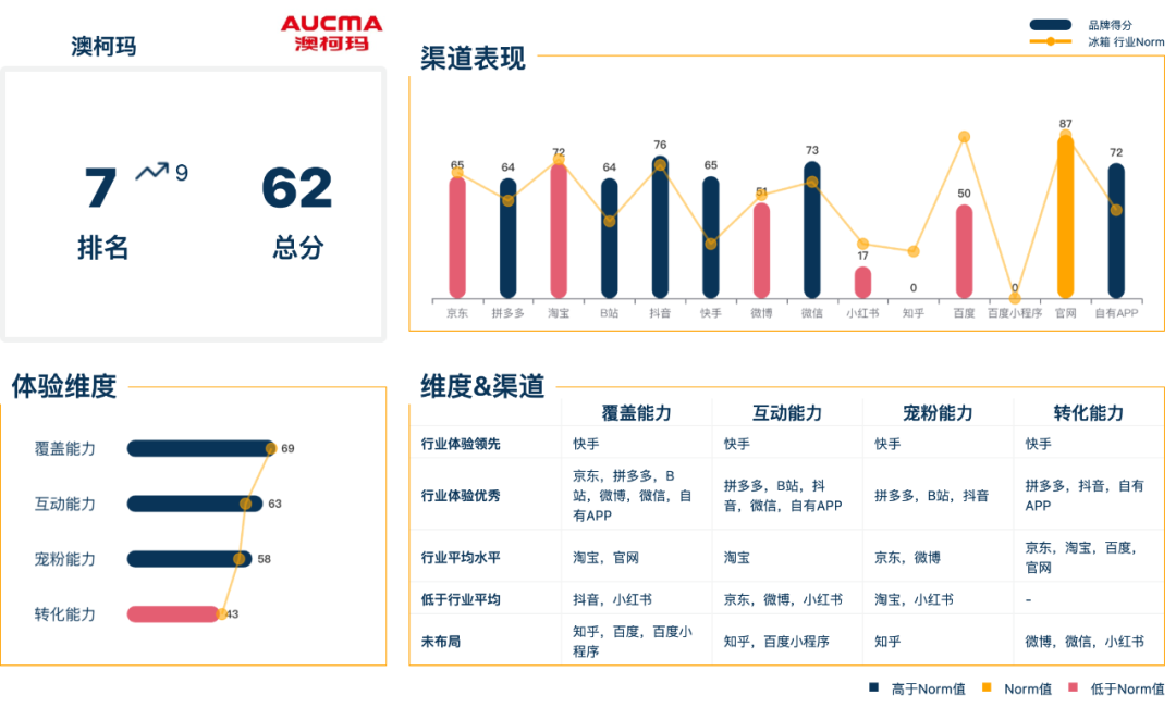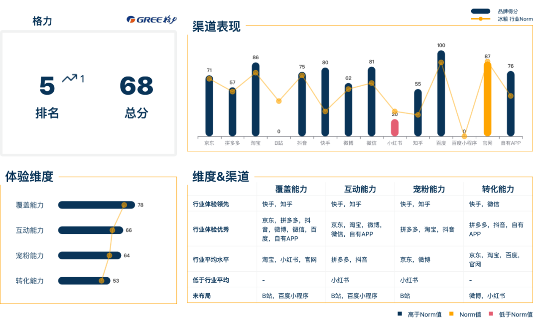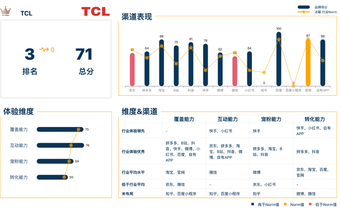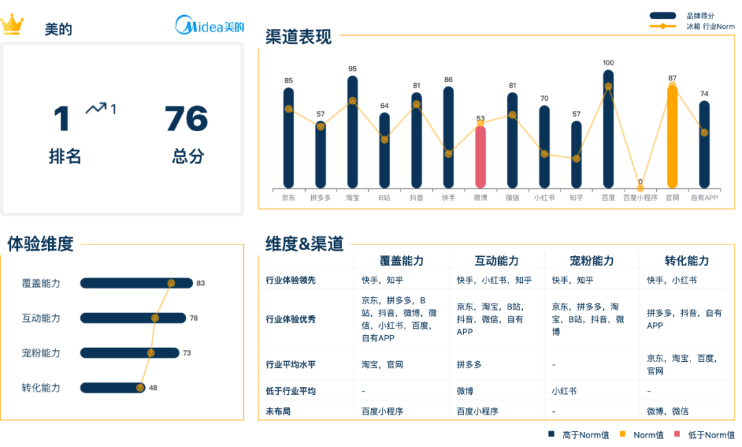 总体来说,冰箱行业的渠道数字化能力较为强劲,能够在大多数渠道上做到较为令人满意的渠道数字化。