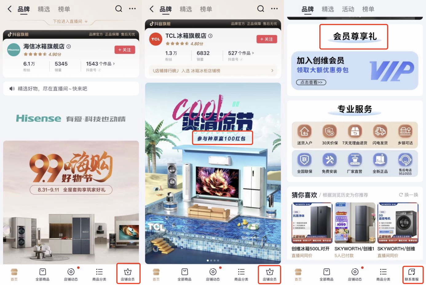 同时,冰箱品牌在抖音平台上对会员入口进行了优化,有82%的品牌在首页设置了会员入口,比上一期增加了14%,这样可以方便消费者注册成为品牌会员享受更多的会员福利,如优惠券、积分、礼品等,以此增加消费者的参与感和归属感,实现会员的长期留存和增值。