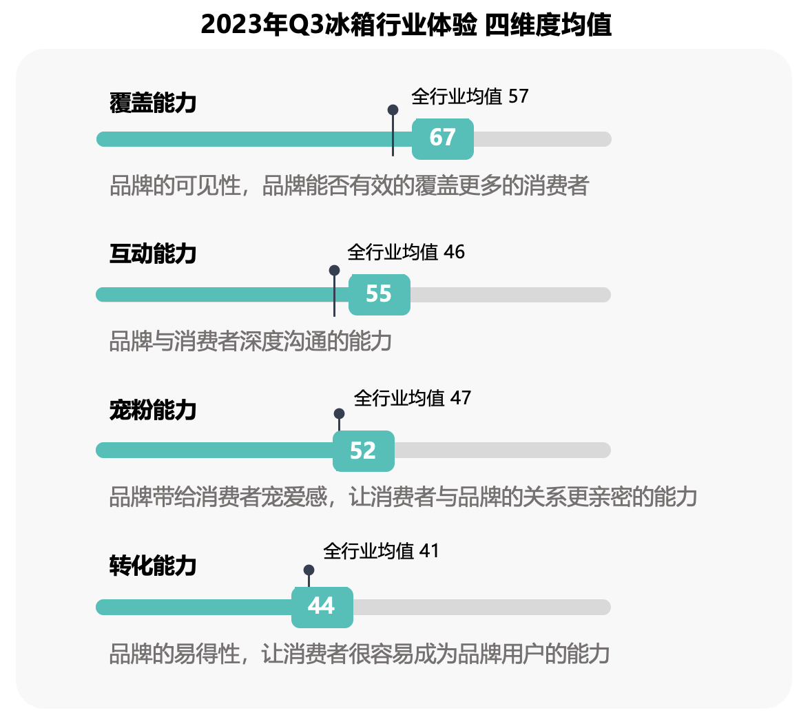 根据2023年Q3的品牌体验数据,我们可以看到冰箱行业四项能力得分高于全行业均值。