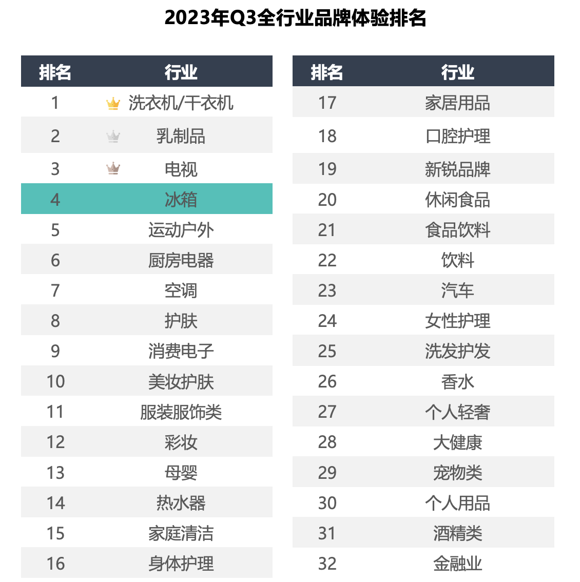 新锶体验发布的2023年Q3全行业品牌体验排名,对各个行业的品牌体验指数进行了综合评估,数据显示冰箱行业的品牌体验指数为58,位居全行业第四名的位置。相较于2023年Q1,本期冰箱行业体验得分增长2分,排名上升2位,表现出较强的竞争力和用户满意度。