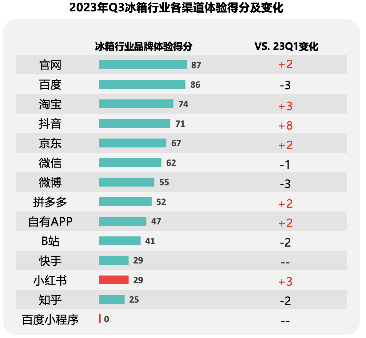 根据2023年第三季度的冰箱行业数据分析,我们可以看到,在14个不同的渠道中,有11个渠道的数字化体验优于全行业的平均水平,其中「官网」渠道的表现最为突出,相较上一期增长2分,得分为87分。「微博」渠道的数字化体验与全行业的平均水平相当。仅2个渠道(小红书、百度)渠道则低于全行业平均水平。
