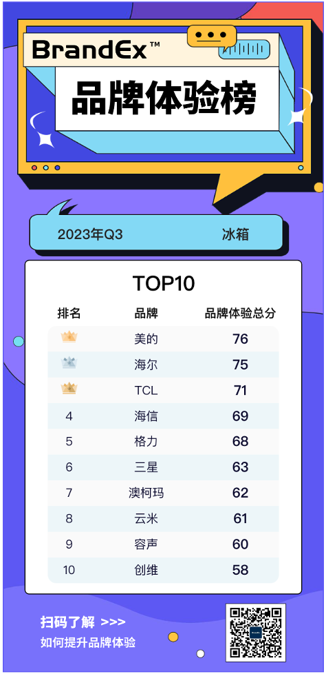 冰箱行业排名第3是『TCL』,品牌排名未变,品牌体验得分为71分。
