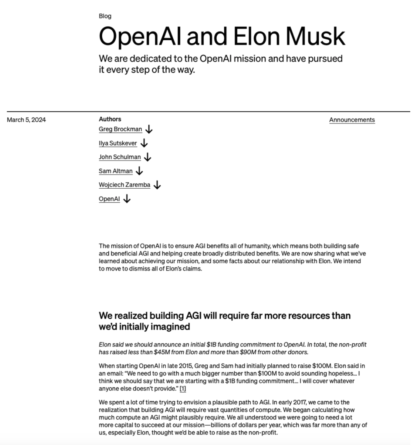 OpenAI周二晚间对马斯克做出了回击,驳斥了马斯克在上周一起诉讼中的说法,并公布了马斯克写的电子邮件,其中内容似乎表明他支持该公司的营利性商业计划。OpenAI称他曾一度希望通过与特斯拉合并来“绝对控制”该公司。马斯克上周对 OpenAI、首席执行官Sam Altman 和总裁Greg Brockman提起诉讼(点击了解详情),指控这家初创公司偏离了构建负责任的人工智能的使命,并且对其最大投资者微软公司负有责任。