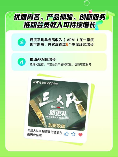 一季度,爱奇艺运营和财务表现稳健,经营效率稳步提升。会员业务作为爱奇艺的核心业务,目标是推动长期可持续的会员收入增长,现阶段关注的重点是提升ARM值和会员的长期留存。ARM值在一季度创下新高,并实现连续6个季度环比增长。这表明爱奇艺加强精细化运营,丰富会员产品和权益,增强会员价值感知的策略卓有成效。其中,加更礼等创新增值服务有效提升了会员付费意愿,当季剧集《三大队》加更礼付费收入破历史记录,并助推该剧内容热度达峰值。