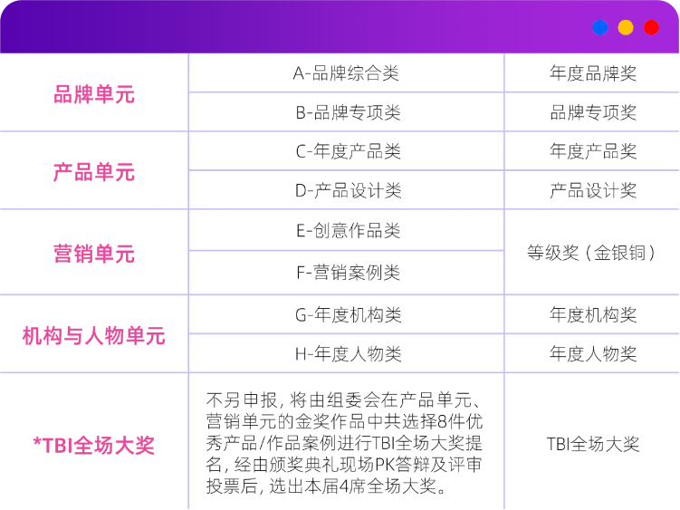 2024第五届TBI杰出品牌创新奖全新升级,经过精细化的赛道划分与优化,共囊括了4大单元、8个类别、逾173个精细划分的赛道,旨在迎合不断演变的多元化营销趋势,同时凸显参赛作品间的创新差异与独特价值。