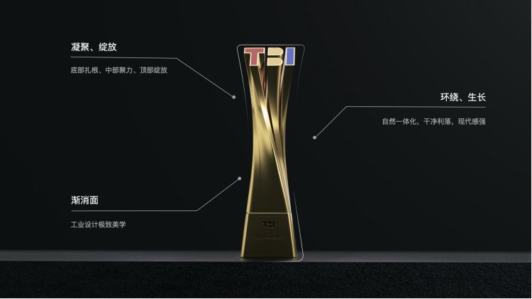 奖杯的主体造型形似一棵参天大树,其整体造型以螺旋上升的姿态,从扎实的根基向上延伸,中部设计汇聚力量之感,顶部设计呈现绽放之姿,并不断向高空蜿蜒攀升,最终勾勒出“TBI"三字母形态,孕育出杰出品牌丰硕的的创新成果。