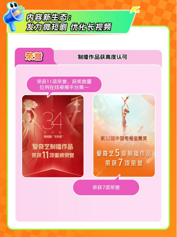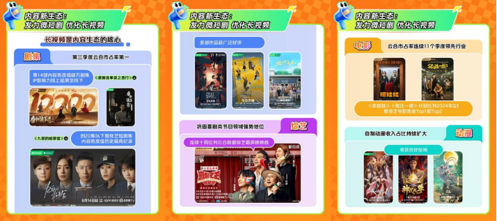 长视频内容作为最核心的娱乐方式之一,其独特的大众影响力和情绪价值无可替代。第三季度,爱奇艺在剧集、综艺、电影、动漫领域均推出了一系列高品质内容,云合市占率持续领跑市场。同时,爱奇艺制播作品获高度认可,先后荣获第34届“飞天奖”11项荣誉和第32届中国电视金鹰奖7项荣誉,“飞天奖”的获奖数量位列在线视频平台第一。