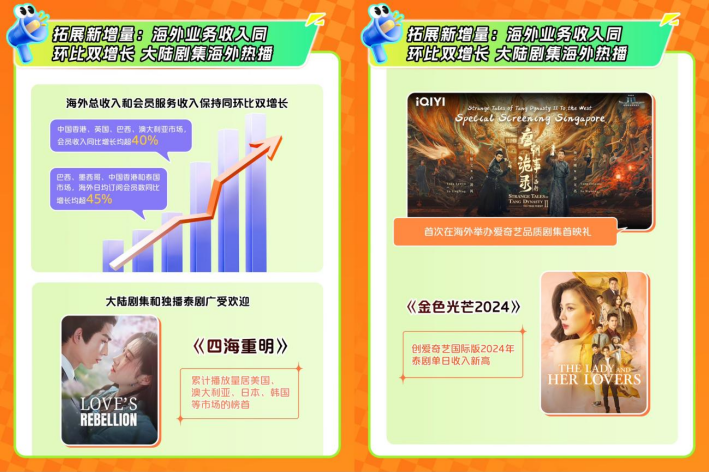 大陆剧集在海外市场的关注热度不断上升。第三季度,《四海重明》累计播放量居美国、澳大利亚、日本、韩国等市场的榜首。海外当地内容方面,爱奇艺国际版独播泰剧《金色光芒2024》成为当地广受欢迎的剧集,创爱奇艺国际版今年泰剧单日收入新高。未来,爱奇艺将继续在海外市场开拓当地合作及商业变现,包括深化与泰国、马来西亚、新加坡、中国香港等地的电信运营商会员捆绑套餐合作。