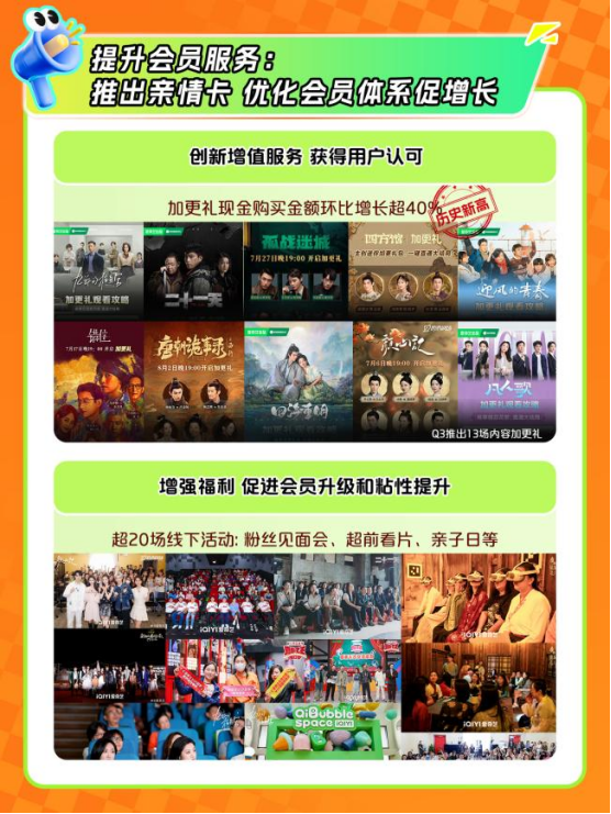 第三季度,爱奇艺会员服务收入44亿元。创新增值服务继续获用户认可。爱奇艺本季度推出了13场加更礼,现金购买金额环比增长超40%,创历史新高。爱奇艺还进一步增强会员福利,举办了超20场线下活动,如粉丝见面会、超前看片和亲子日等,促进会员升级、增强会员粘性。