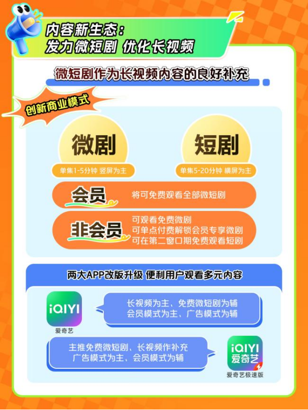 为了更便利用户观看多元内容,爱奇艺正在对两大APP做改版升级,并陆续上线中。改版完成后,爱奇艺APP内容供给上以长视频为主、免费微短剧为辅,商业化方面以会员模式为主、广告模式为辅;改版后的爱奇艺极速版APP主推免费微短剧并以长视频内容作为补充,商业化方面以广告模式为主、会员模式为辅。