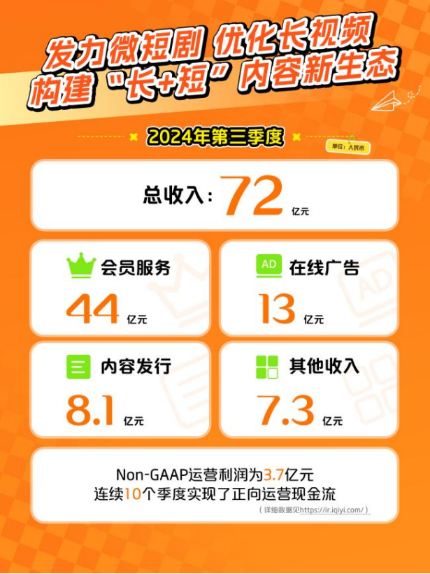 11月21日,爱奇艺(NASDAQ:IQ)发布截至2024年9月30日未经审计的第三季度财报。第三季度爱奇艺总收入72亿元人民币。其中,会员服务收入44亿元;在线广告服务收入13亿元;内容发行收入8.1亿元;其他收入7.3亿元。当季,爱奇艺Non-GAAP(非美国通用会计准则)运营利润为3.7亿元,连续10个季度实现了正向运营现金流。