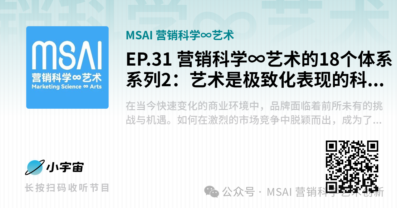 《MSAI营销科学∞艺术》EP.31节目“营销科学∞艺术的18个体系系列2:艺术是极致化表现的科学 科学是抽象的艺术 |串台钱钱品牌局”将通过一次深入的对话,探讨18个体系及其在品牌营销中的重要性。