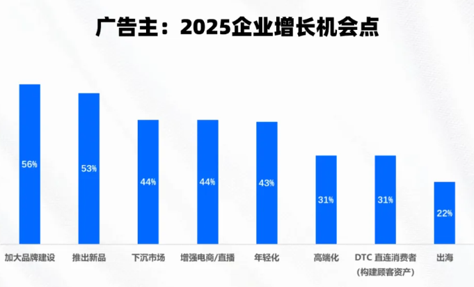 面对2025年预算下降的现状,70%的人选择投放ROI更高的媒体,位列第一,53%选择减少品牌投放增加效果投放,较去年增加11个百分点,48%选择创新产品,寻找市场突破机会,但当询问2025年大环境下企业增长的机会点时,56%广告主认为是加大品牌建设,位列第一。品效割裂愈演愈烈。