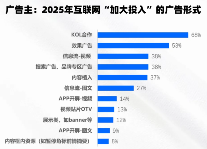 增投的广告形式,以微博为代表的社交媒体平台KOL和以视频号、抖音电商为代表的效果广告最高,增投比例分别为68%和53%。