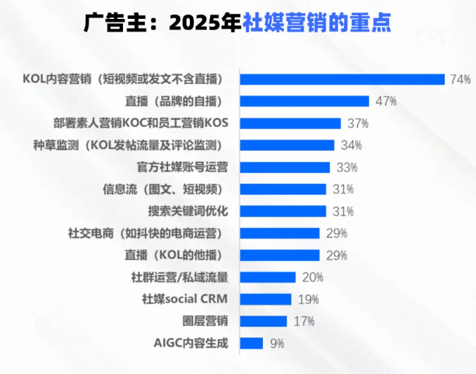 2025年,和整体营销投资增速下滑一致,企业在社交媒体营销投入预期增长也将放缓,平均增长10%,相对整体增速乐观。