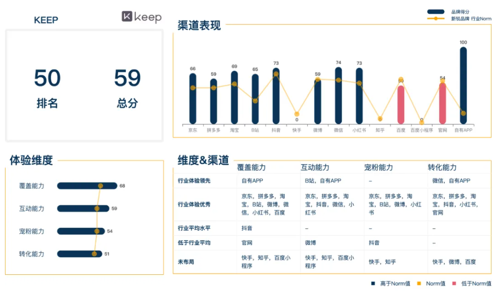 可以看到,keep在覆盖维度得分68分,高出行业Norm19分。覆盖能力也是Keep相对于其他移动应用的优势所在。除了app自身的完善外,Keep还积极拓展电商、社交媒体等多个渠道,并在这些大众平台上设立了官方账号,目前已经覆盖78%以上的大众渠道。这一积极拓展举措,似乎也在向外界放出品牌化、以消费品业务作为未来发展的重点的信号。
